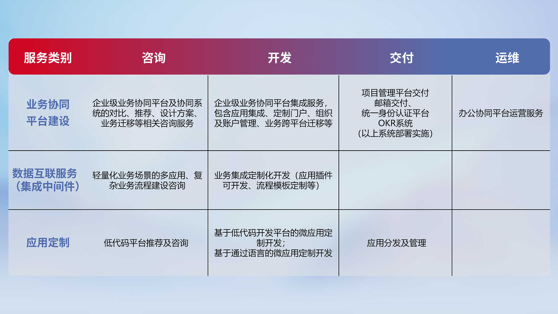 针对钉钉、、、、企微、、、、IDaas等平台级产品提供产品的规划、、方案、、交付、、、、定制化开发等服务,,实现如统一协同办公、、、智能客户服务、、、、混合会议管理、、、、智能数据查询、、、等业务场景,,实现数字化转型。。。。